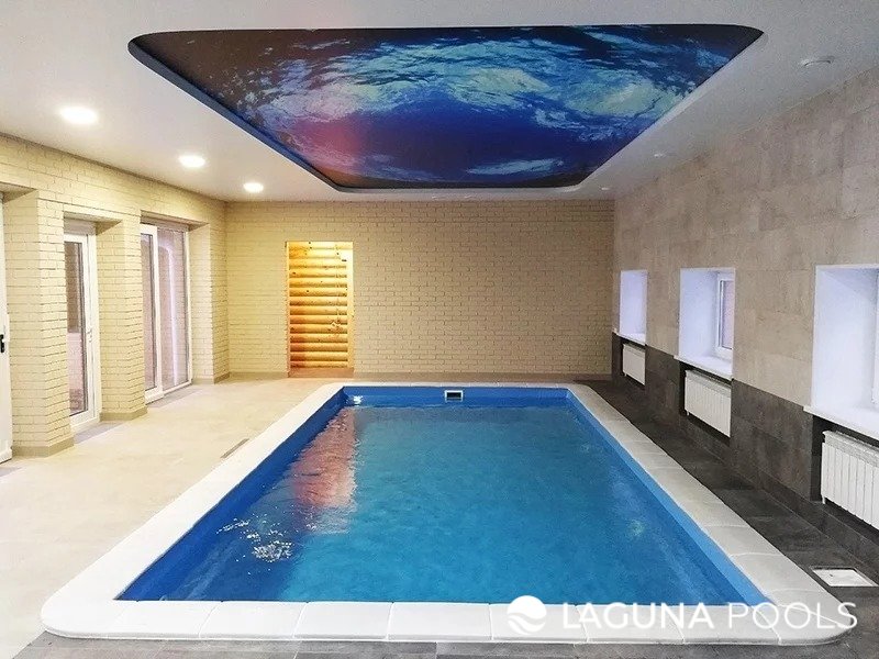 Прямоугольный композитный бассейн в комнате с отделкой плиткой